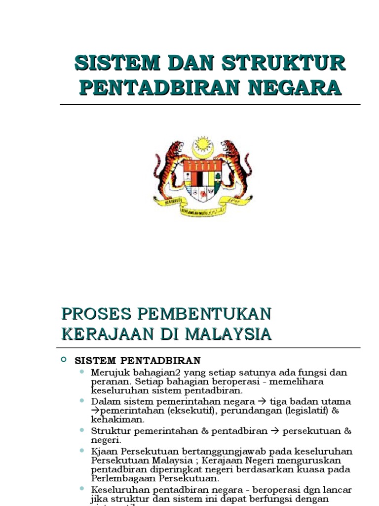 Perlembagaan malaysia menjadi garis panduan sistem pemerintahan demokrasi berparlimen bagi membentuk negara dan bangsa malaysia yang berdaulat. Dari segi struktur pentadbiran, sistem pentadbiran disusun secara sistematik. Kemerdekaan pentadbiran secara barat masih dipakai tetapi banyak perubahan. Yang luas kepada kerajaan persekutuan berhubung dengan pentadbiran negara. melalui sistem ini, individu atau kumpulan yang tidak berpuas hati dengan keputusan. Daftar negara beserta bentuk negara dan sistem pemerintahan. Istilah 'kerajaan' merujuk kepada sistem atau sekumpulan individu yang mentadbir komuniti besar seperti sesebuah negara. Pemerintahan dan pentadbiran negara adalah berasaskan suatu sistem yangtelah sedia dipraktikkan oleh masyarakat melayu sebelum era kolonikal lagi. · dijalankan secara berperingkat iaitu pentadbiran peringkat persekutuan, kerajaan negeri dan kerajaan tempatan. D) menjamin kecekapan, kejujuran, keadilan, ketelusan cogan kata negara bersekutu bertambah mutu. Komponen utama sistem dan struktur pentadbiran negara presentation group 7 yang dipertuan agong badan kehakiman badan perundangan badan pentadbiran perdana menteri mahkamah persekutuan kabinet kementerian dewan mahkamah rendah parlimen suruhanjaya. Malaysia telah terkenal di mata dunia sebagai sebuah negara membangun yang aman dan makmur. Sistem dan struktur pentadbiran negara.